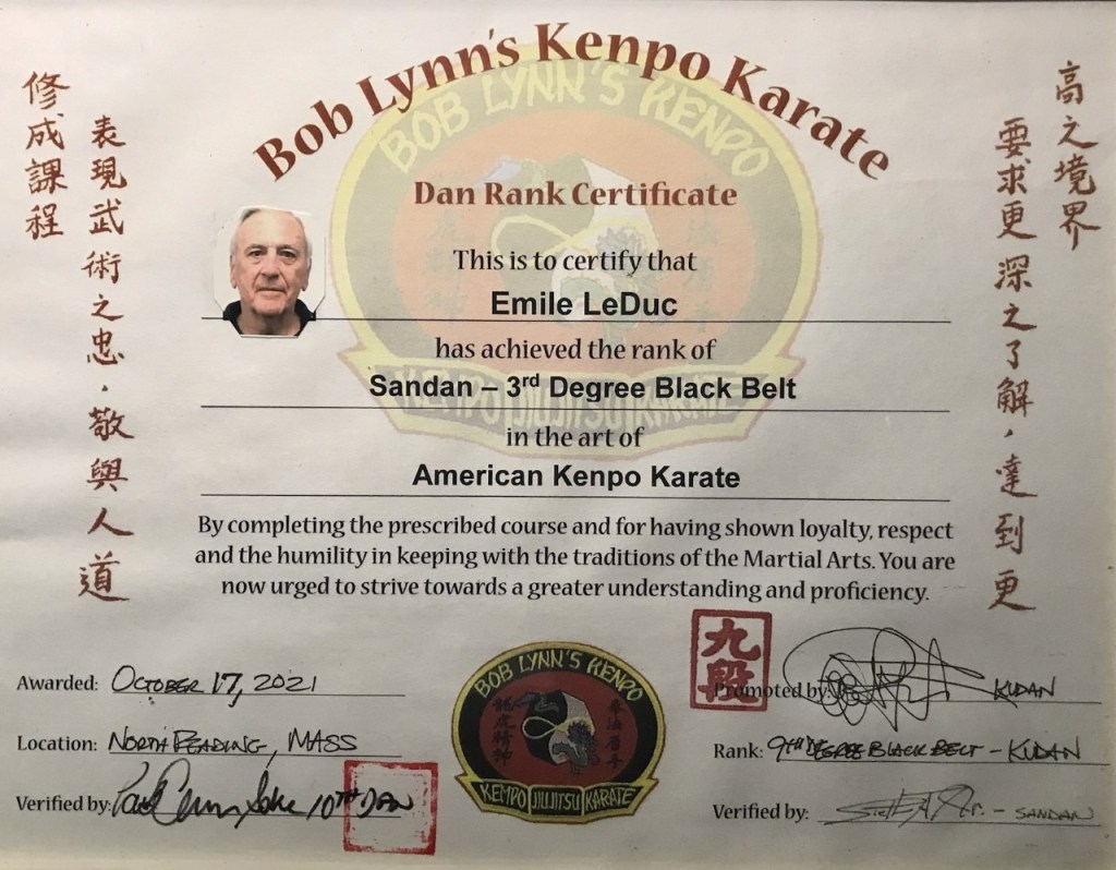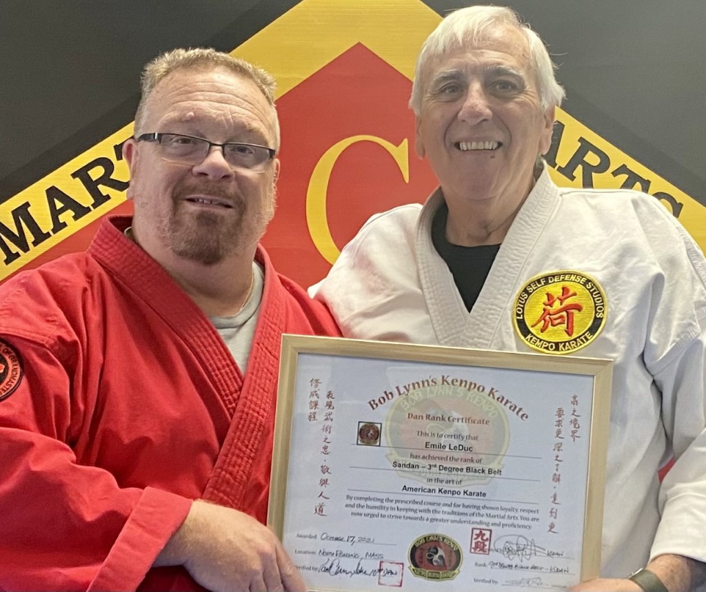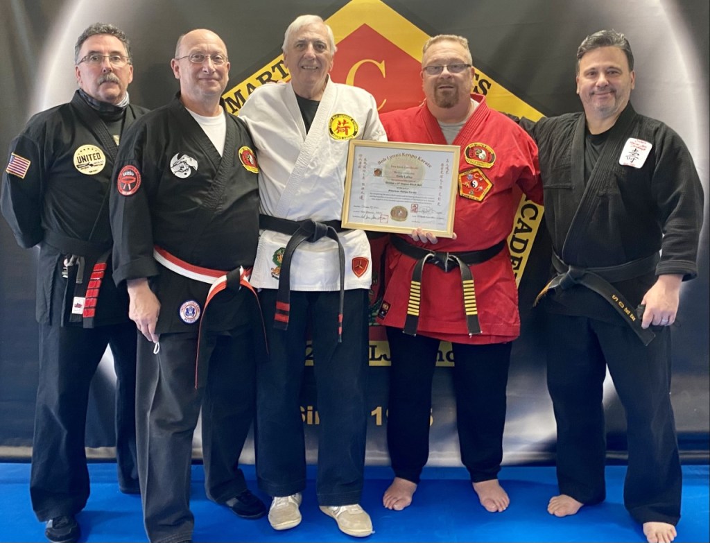 On October 17, 2021, Emile Leduc was promoted to 3rd degree black belt in the art of American Kenpo Karate. Present for his test was Soke Paul Cervizzi, Shihan Daniel Taylor, Renshi Steve Taranto, and Grandmaster Bobby Lynn. Congratulations, Duke!